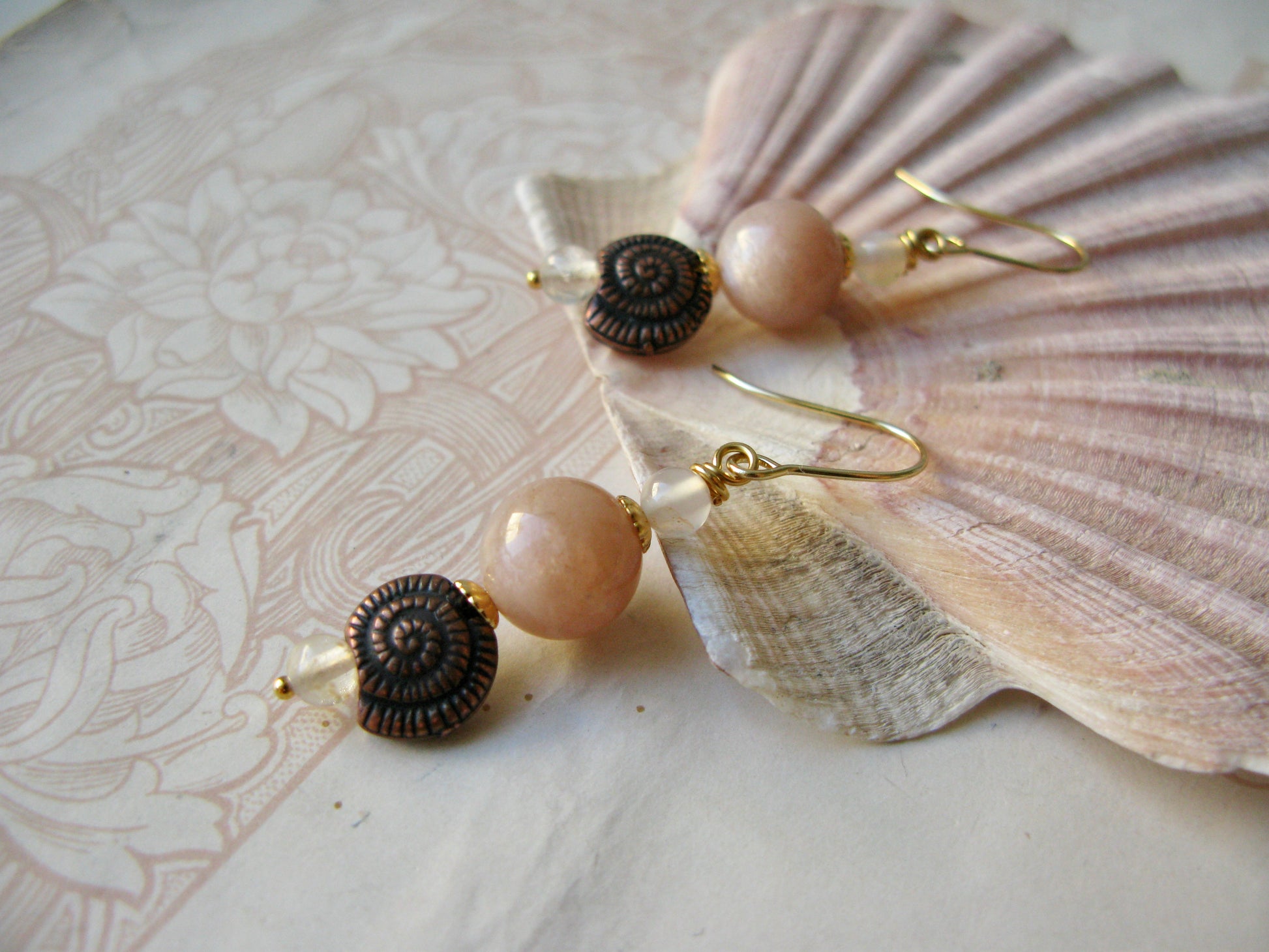 Luscious, nurturing, romantic pink moonstones (10mm in diameter) and honey quartz stones meet copper plated brass ammonite shaped beads that I have purchased from a small local atelier in Barcelona over a decade ago.