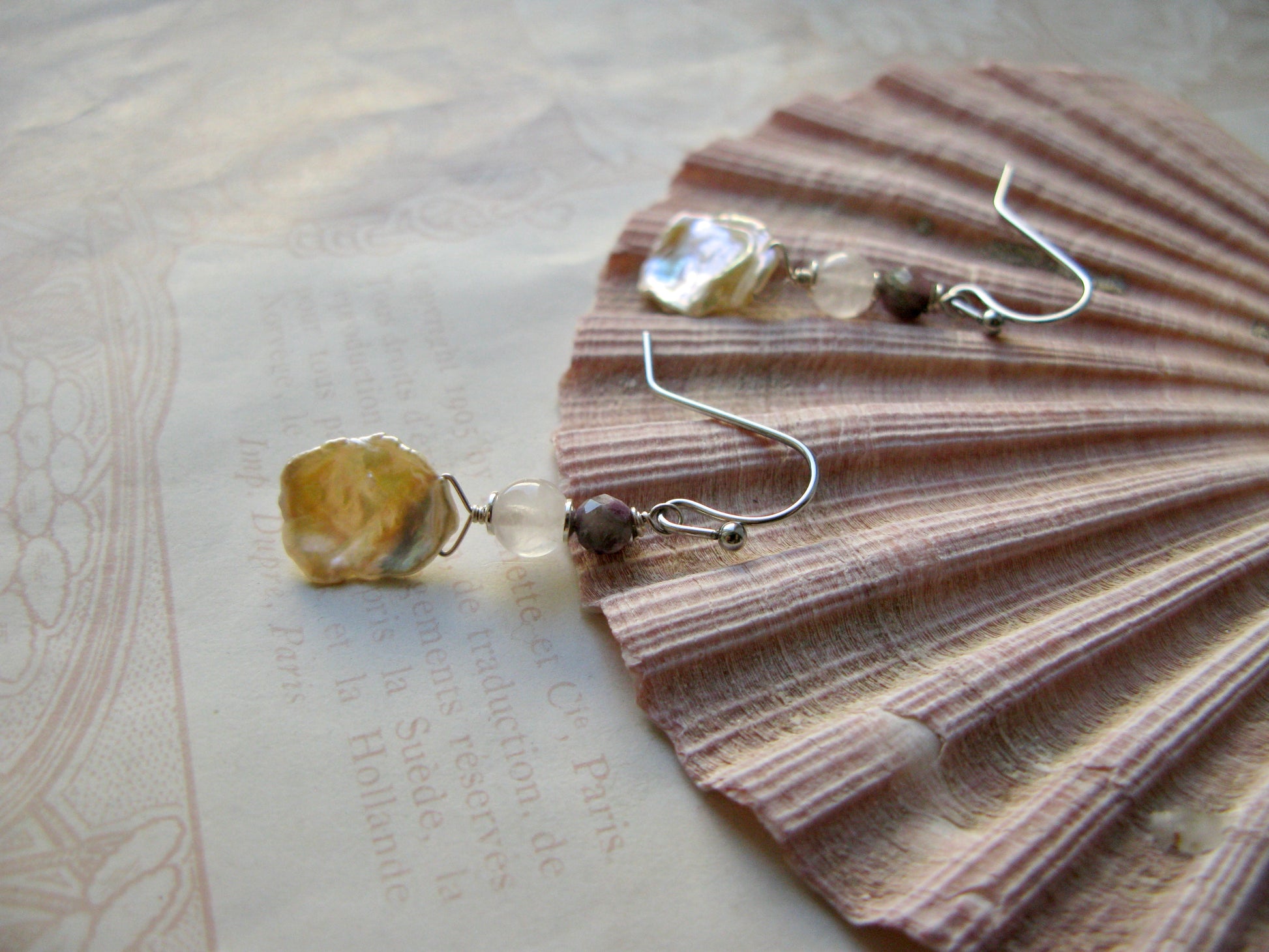 The keshi pearls' ability to glow with light is unrivaled and also hard to catch with the camera! This colour flatters every skintone and is so versatile. Since all pearls are unique, the shape of them can slightly vary from one pair to another and not be exactly the same as in this photo. Same goes to tourmaline gemstones, each one is unique but I have chosen earthy, slightly rosy hues for this earring style.