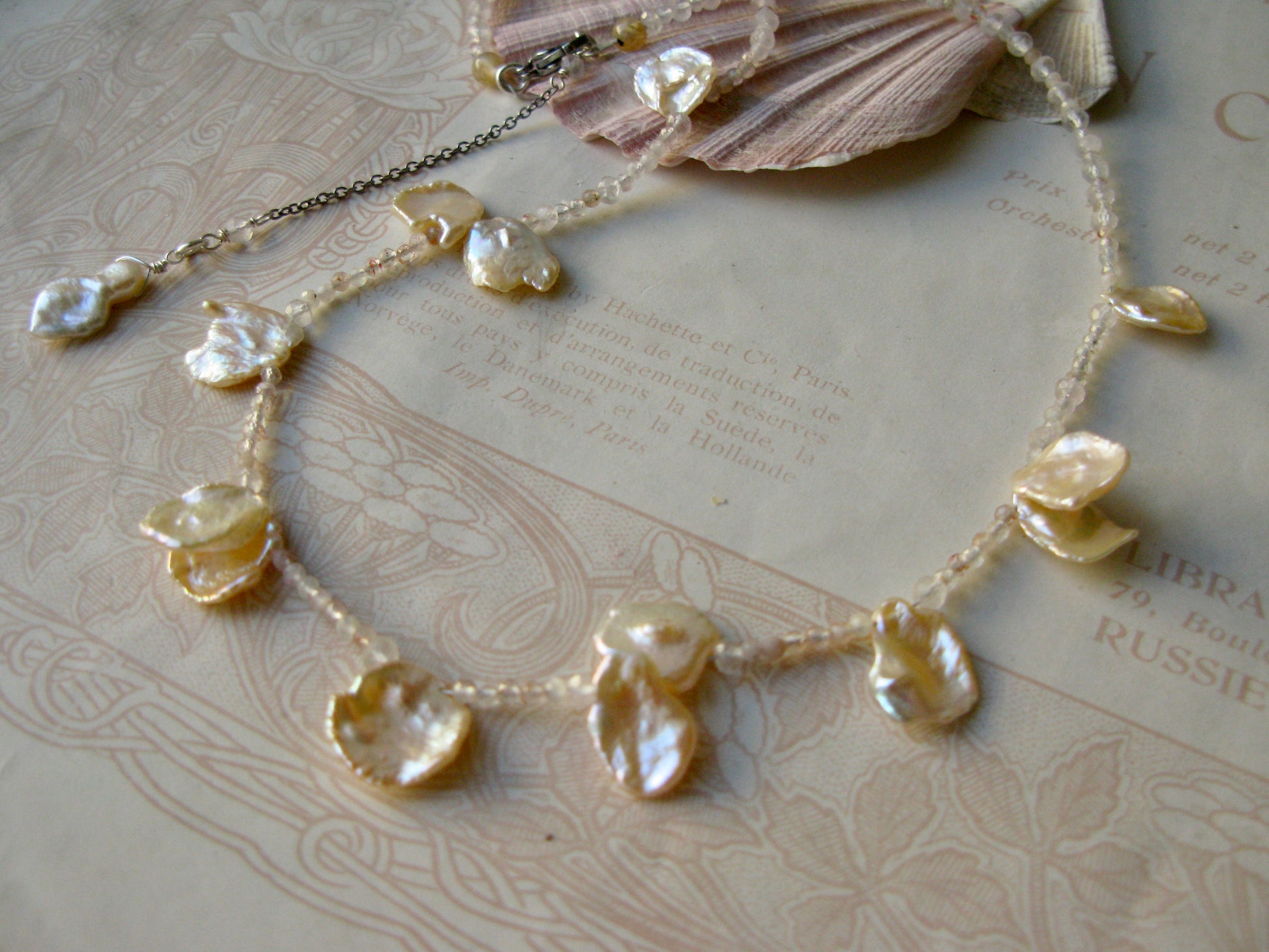 Luminous, whimsical and just gorgeous in their delicate appearance, these freashwater pearls (the flat shape is called 'keshi') are so unique! The colour is natural with a hint of rosy, powdery peach. I've combined them with a string of tiny 2-3mm arusha and rose quartz gemstones for an airy look.