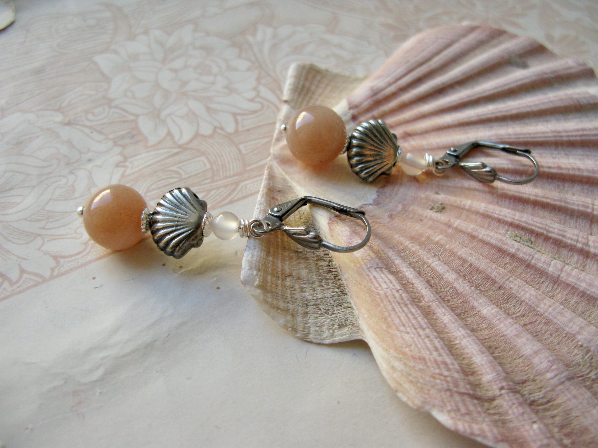 Luscious, nurturing, romantic pink moonstones (10mm in diameter) and pale agate stones meet antique silver plated brass seashell beads that I have purchased from a small local atelier in Barcelona over a decade ago.