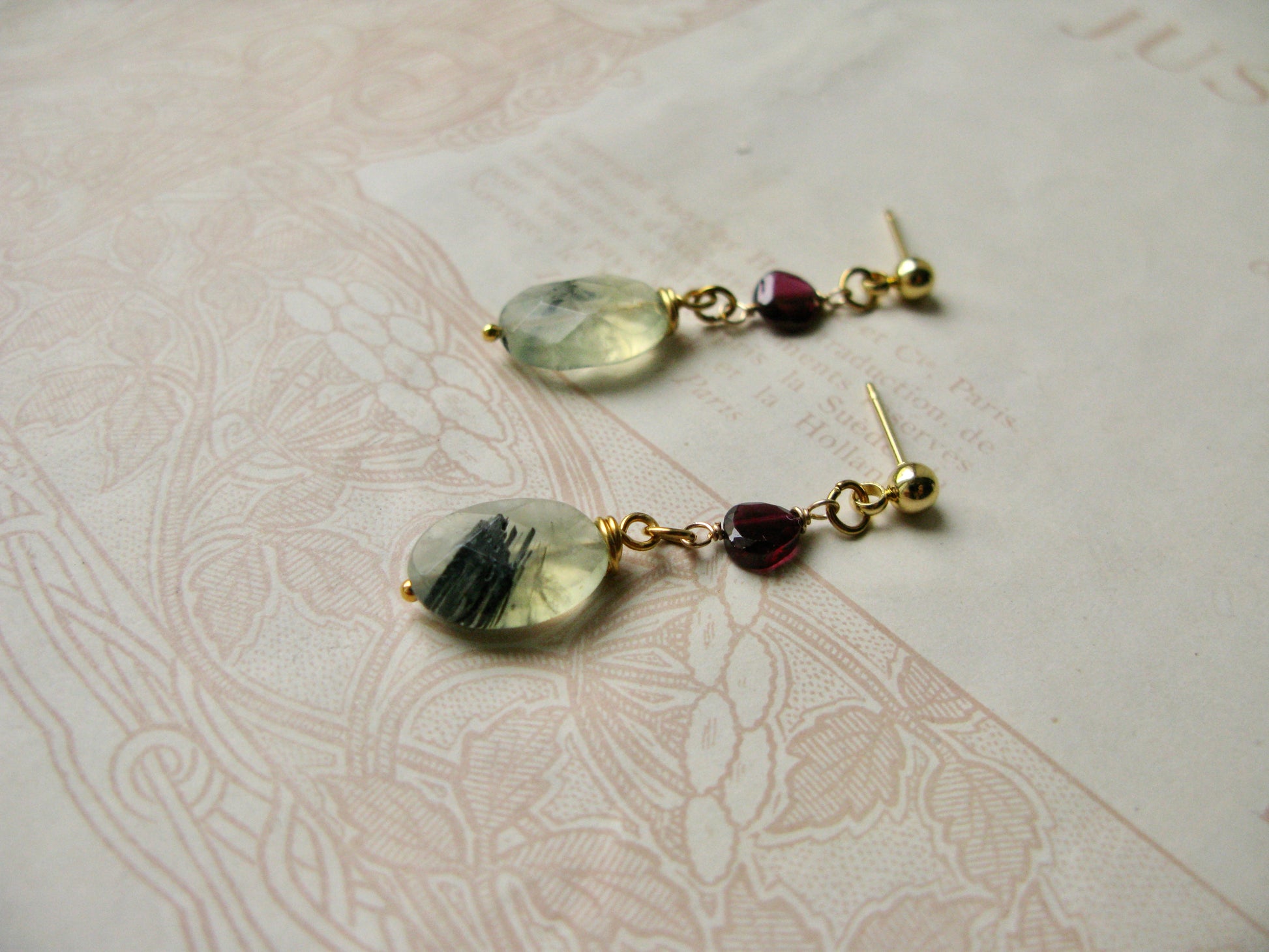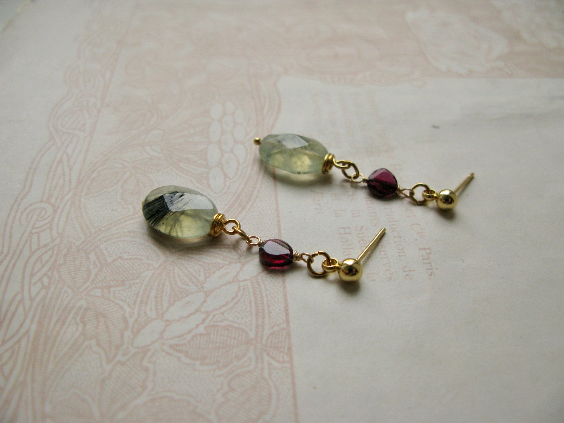 These Secret Garden earrings feature a delicious duo of natural red garnet and faceted prehnite gemstones. The dark green inclusions on the prehnites are like a miniature strokes of abstract art from nature, so interesting. The stones are wrapped with gold fill wire and the earring posts are gold plated steel.