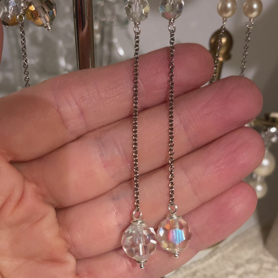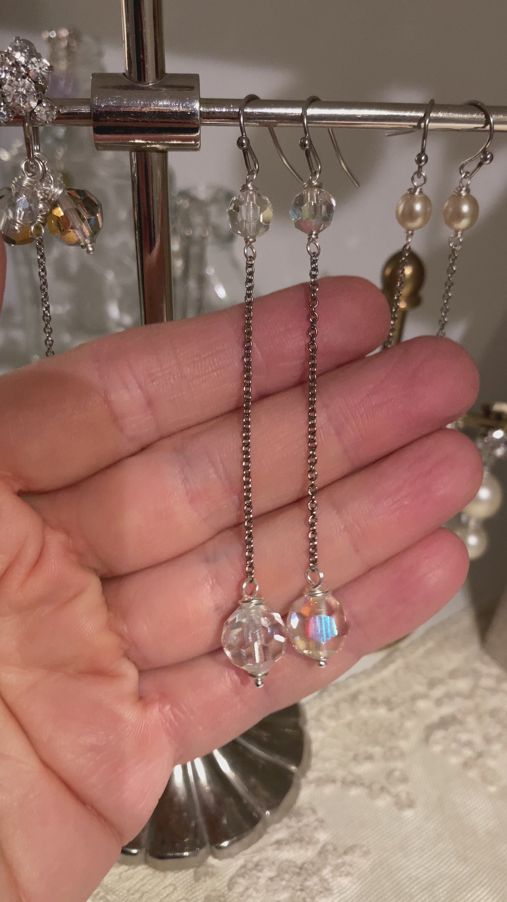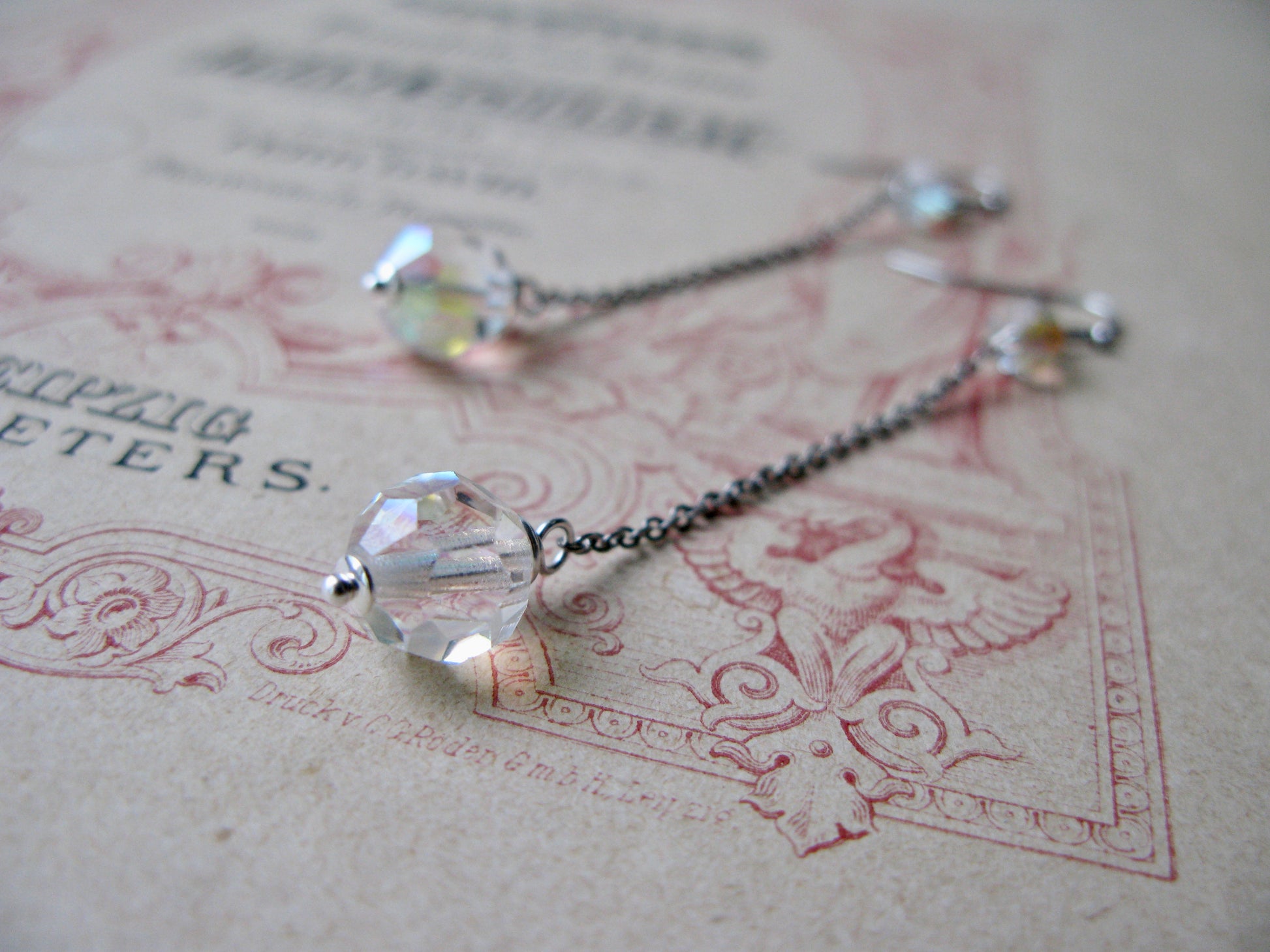 They feature adorable vintage Austrian crystals in a colour called "crystal a/b", meaning that clear crystals are partly coated with a shimmering aurora borealis coating. They delicately reflect all colours of the rainbow, depending on the light and colours found in the surroundings. These crystals are salvaged from a broken necklace from approximately 1950s-60s. The sleek steel chain is unused vintage. Hooks are skin-safe stainless steel.