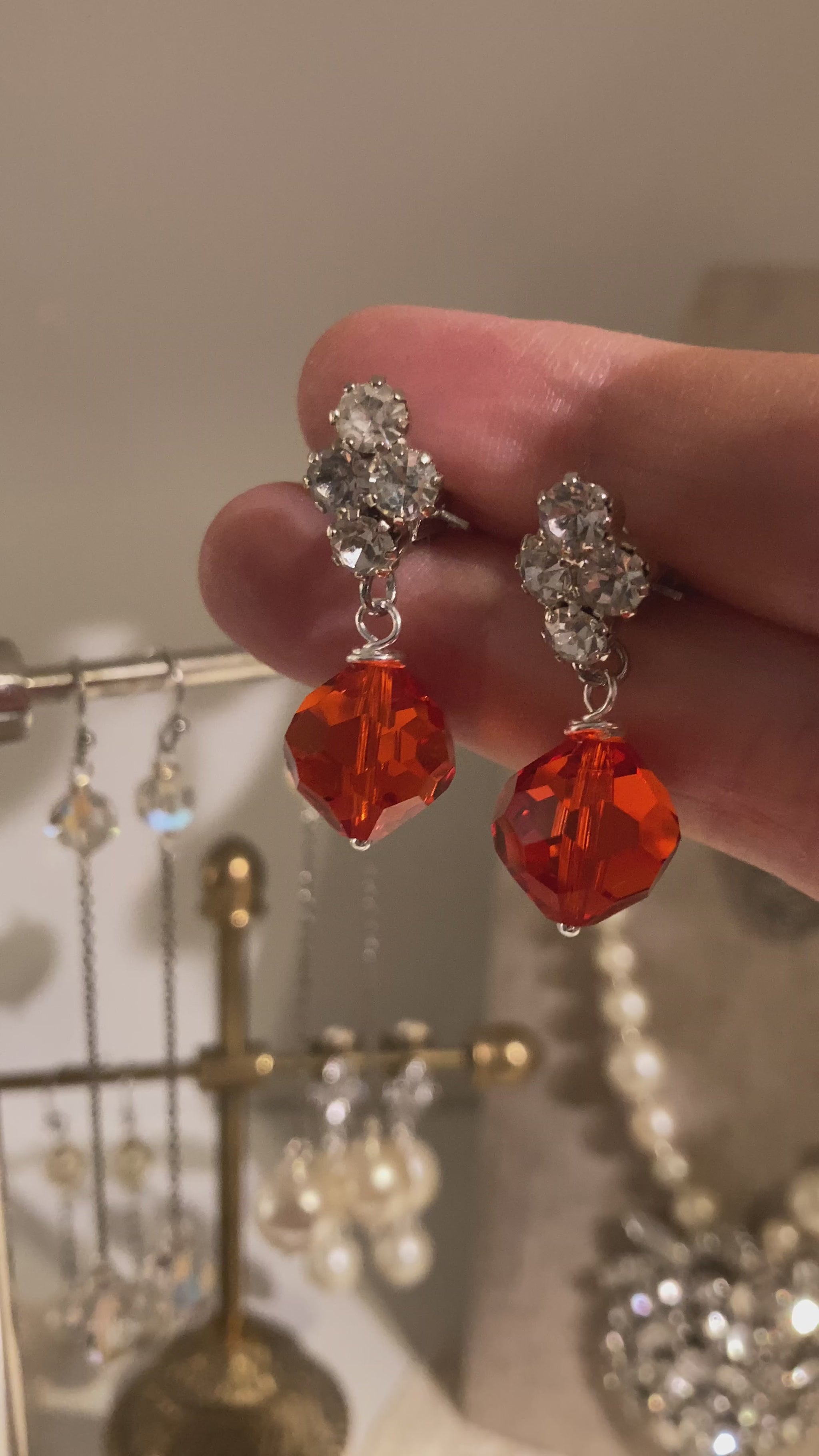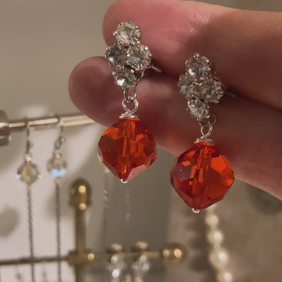 They feature absolutely stunning vintage Austrian D.S. & Co. crystals in a colour named "hyacinth", a mind-blowing orange red. The crystals are from the 1970s, never before used new old stock from the manufacturer's original package. The pendants are attached on gorgeous, clear crystal studded vintage (new old stock, never before used) clip-ons. Very comfortable on the ear and they sparkle so elegantly!
