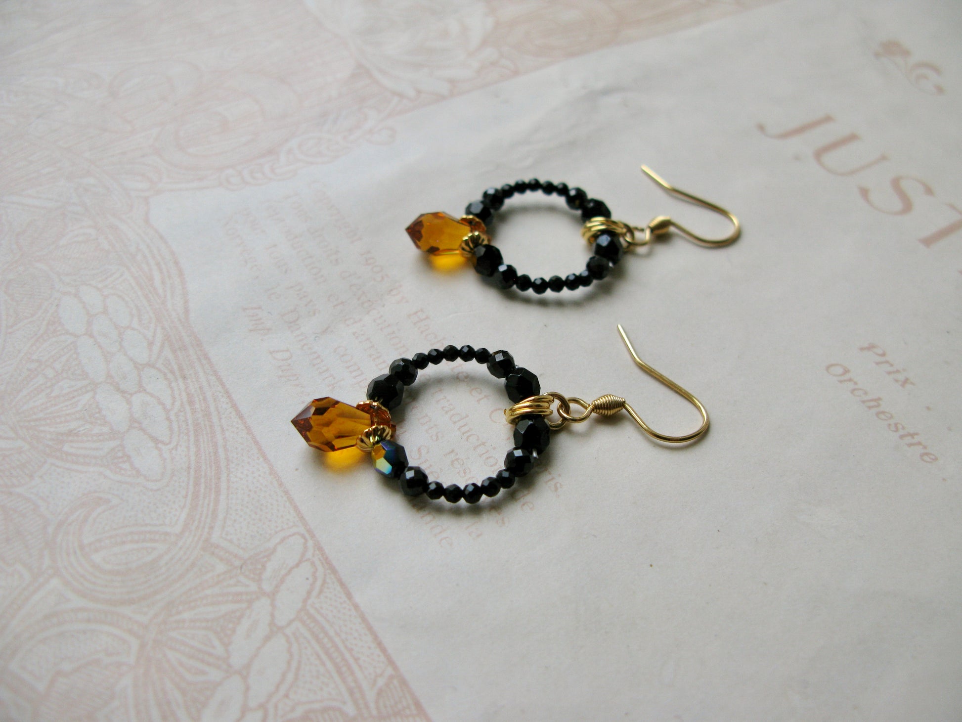 These adorable little hoops feature topaz/cognac tone Primero crystal drops with partly gold tone black Primero crystals on either side. In addition, tiny & shiny black agate gemstones all around with finally black Czech glass beads.